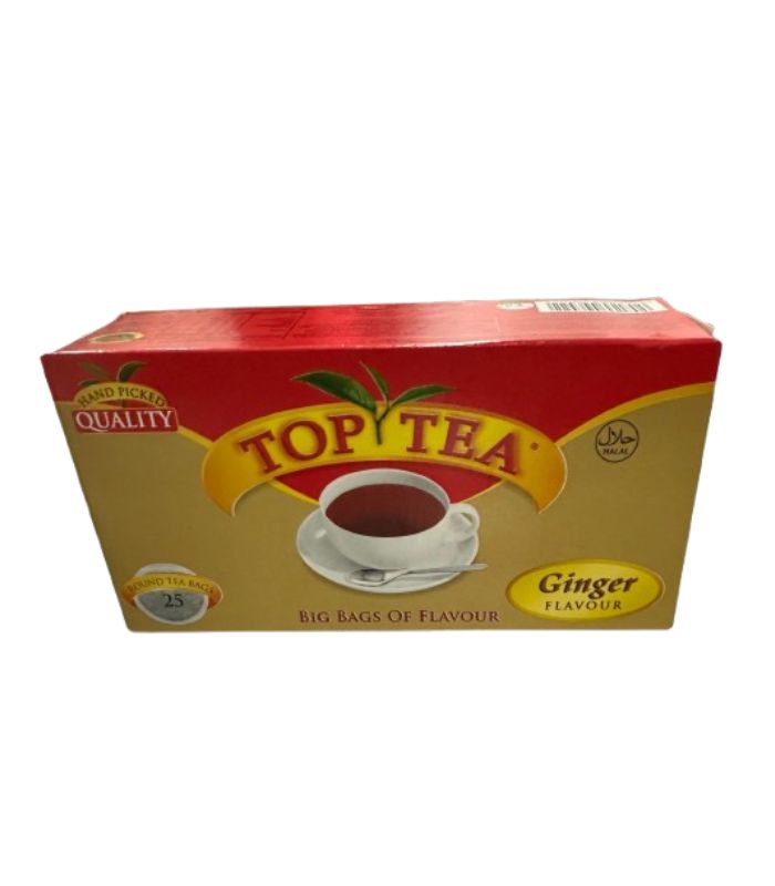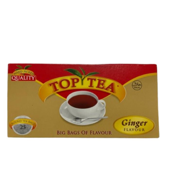 Top Tea Ginger Flavour 50g features 25 round tea bags infused with the warm and aromatic taste of ginger. This blend combines the richness of quality tea leaves with the spicy kick of ginger for a distinctive flavour experience. Ideal for relaxation or cool weather, ginger tea offers a comforting beverage option. The round tea bags allow effective infusion for fuller taste and aroma. Easy to prepare, it can be enjoyed plain or sweetened to preference. The 25-bag pack provides convenient daily servings for home or office use. Top Tea maintains consistent quality to ensure satisfying flavour in every cup. Whether enjoyed in the morning or evening, Top Tea Ginger delivers warmth and refreshing taste.